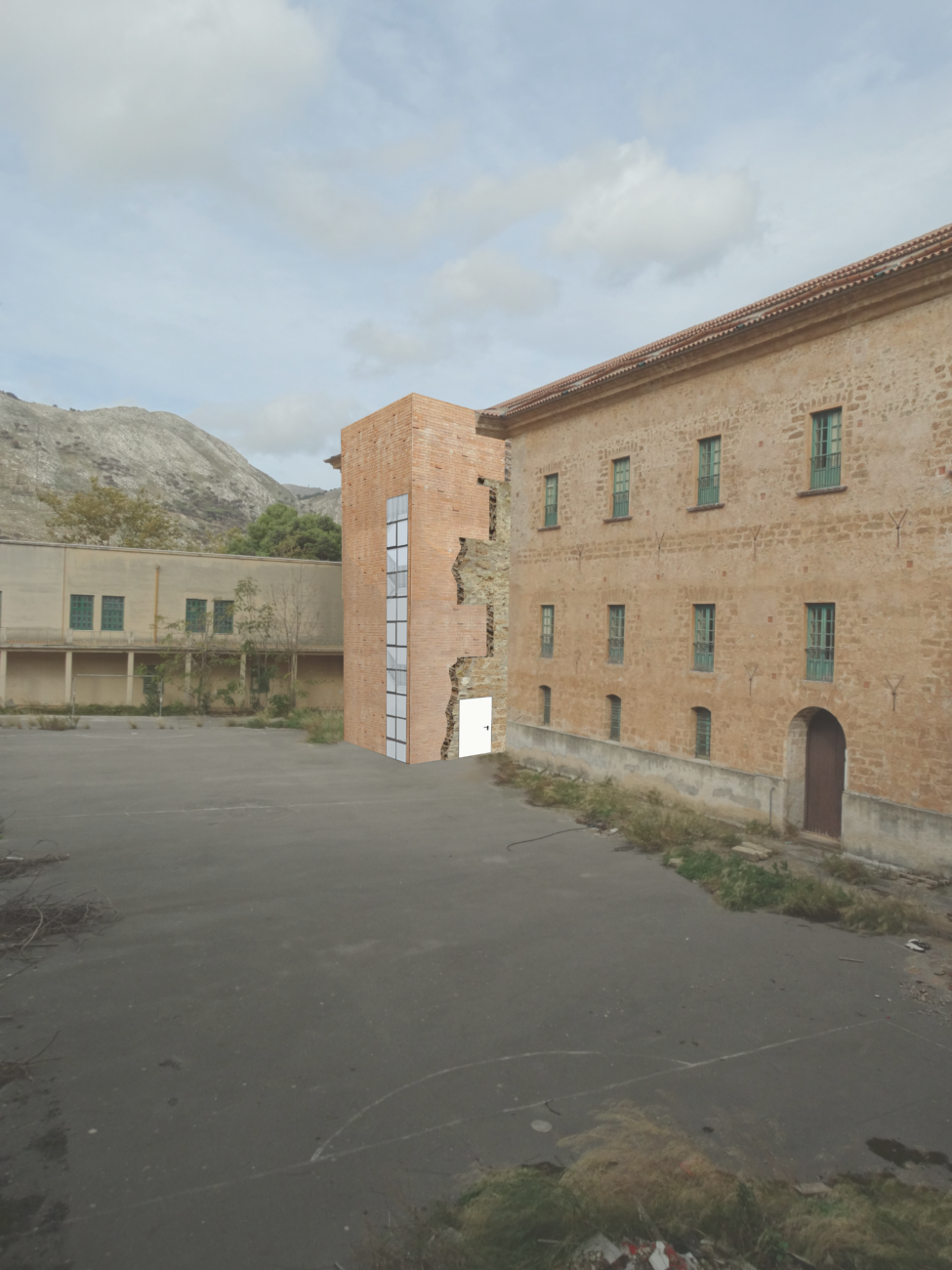 Il nuovo blocco è destinato esclusivamente a funzioni di servizio. In particolare, sono previsti un nuovo vano scala e un vano ascensore, necessari per garantire accessibilità e fruizione ai vari livelli del blocco principale, dove si concentrano le attività scolastiche e le funzioni dell’abbazia.